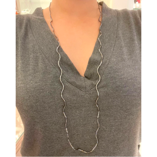 Colar semijoia mix banho ródio negro. Fio longo todo em canutilhos ondulados, articulados – montados em fio de couro. Fecho ímã. Dois em um: pode ser usado como pulseira. Niquel free