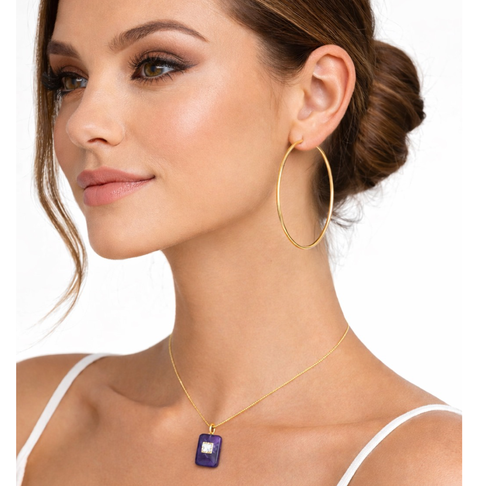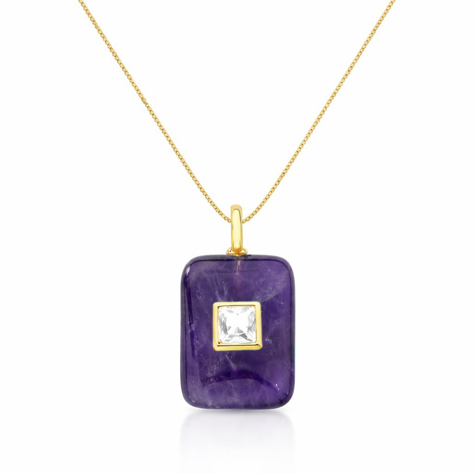 Colar semijoia banho ouro 18k. Corrente veneziana finíssima em PRATA 925. Pingente pedra ametista natural formato retangular com ponto de luz ao centro. Niquel free