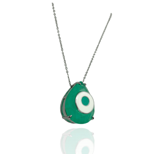Colar semijoia banho ródio. Corrente elos cart. com pingente gota cristal esmeralda fusion com aplique olho grego esmaltado na cor branca. Niquel free