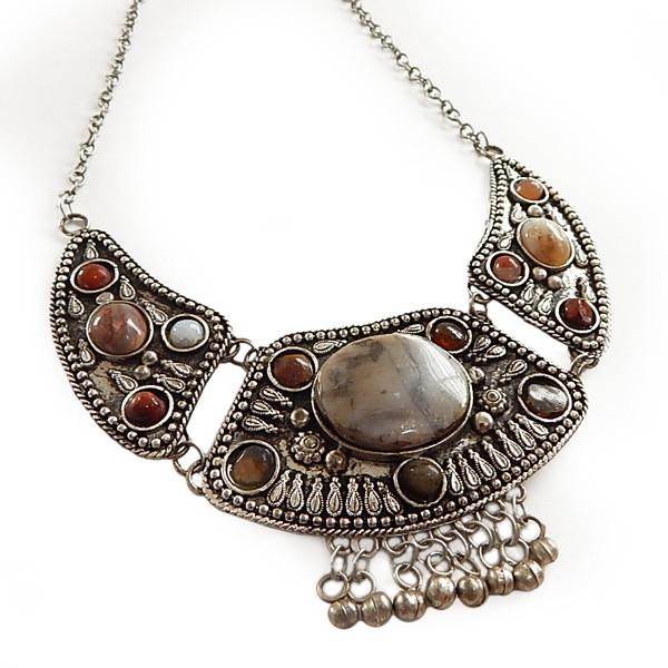 Maxi colar bijuteria prateada. 3 placas articuladas, pedras redondas marmorizadas e berloques.