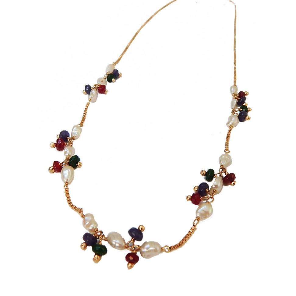 Colar semi joia banho ouro 18k. Corrente veneziana com mix de pérolas de água doce e cachos de jade: rubi, esmeralda e safira.