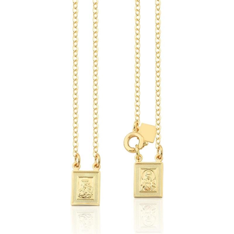 Colar semijoia banho ouro 18k. Modelo escapulário. Placas fixas: Nossa Senhora do Carmo e Sagrado Coração de Jesus- retangulares. Com fecho. Uso adulto – unissex – ou infantil