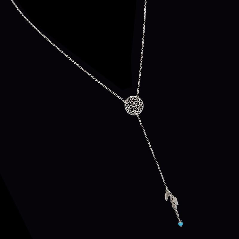 Colar semi joia banho ródio.Corrente elo português. Mandala trabalhada e vazada, franja com detalhes em penas e bola turquesa reconstituída.