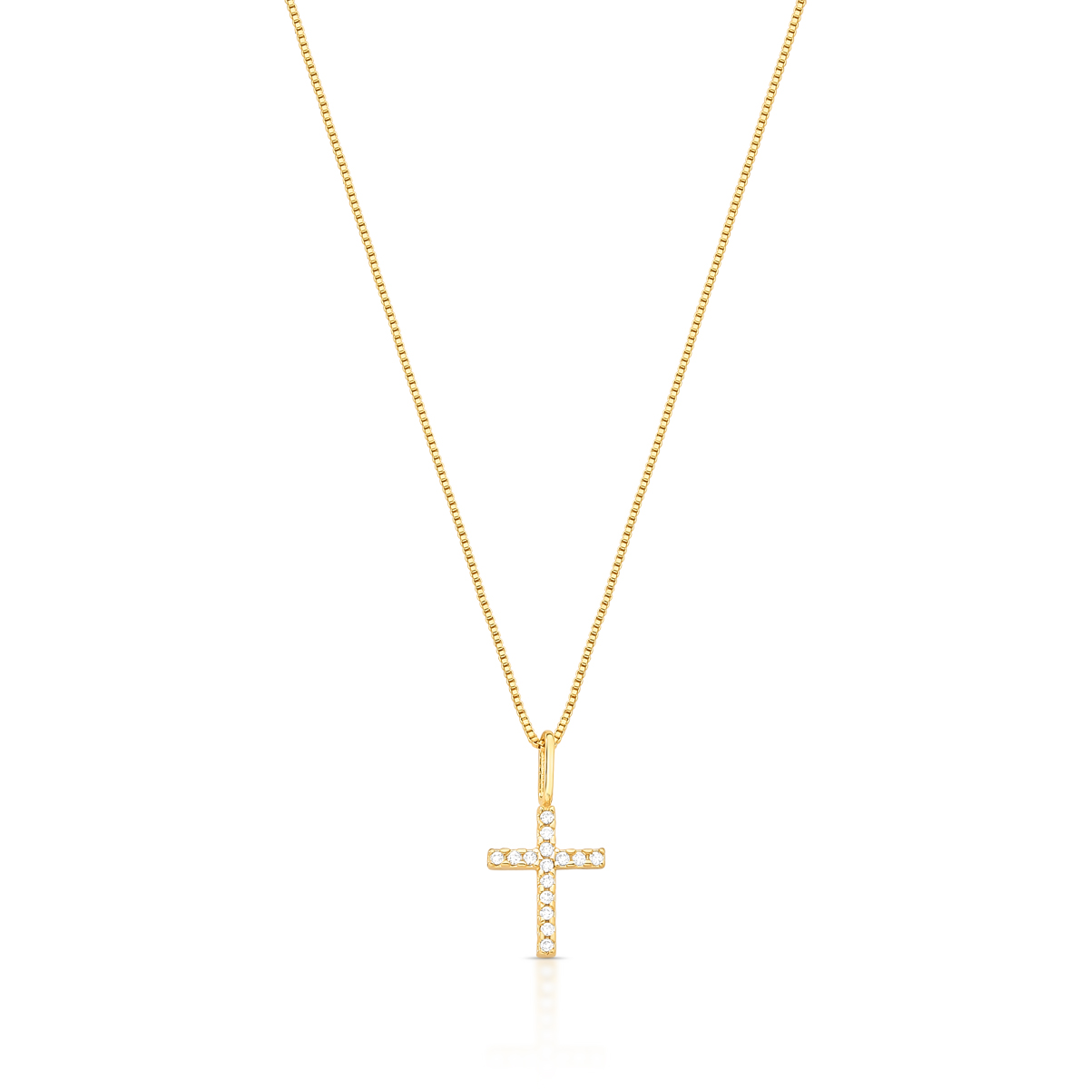 Colar semijoia banho ouro 18k. Corrente veneziana com pingente mini cruz cravejada. Niquel free