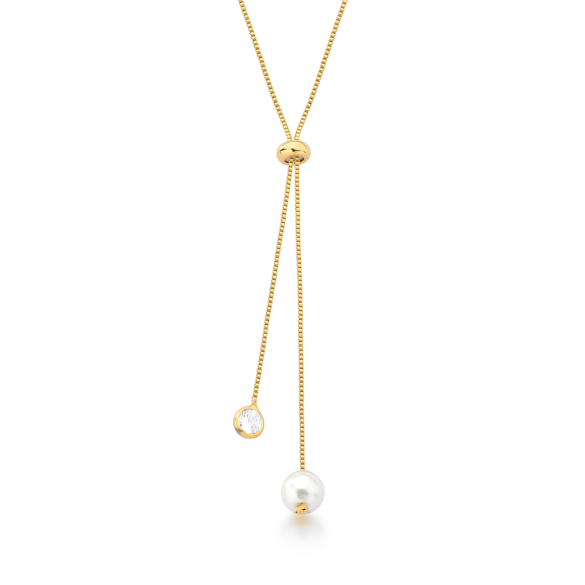 Colar semijoia banho ouro 18k. Modelo gravata em corrente veneziana regulável, com ponto de luz e pérola nas extremidades. Sem fecho. Niquel free
