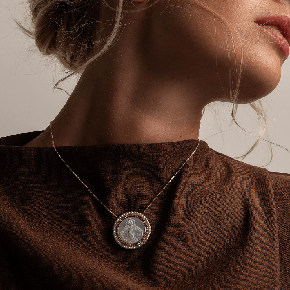 Colar semijoia banho ouro 18k. Corrente veneziana com medalha fixa de Nossa Senhora das Graças esculpida em madrepérola. Contorno duplo: cravejado com zircônias coloridas e mini pérolas shell. Niquel free