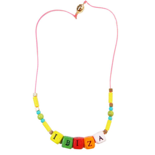 Colar semi joia peças em banho ouro 18k. Fio de silicone cor pink neon, com cubos em madeira tingida, cores sortidas e letras pintadas, canutilhos, entremeios e resinas coloridas. Fecho ímã.