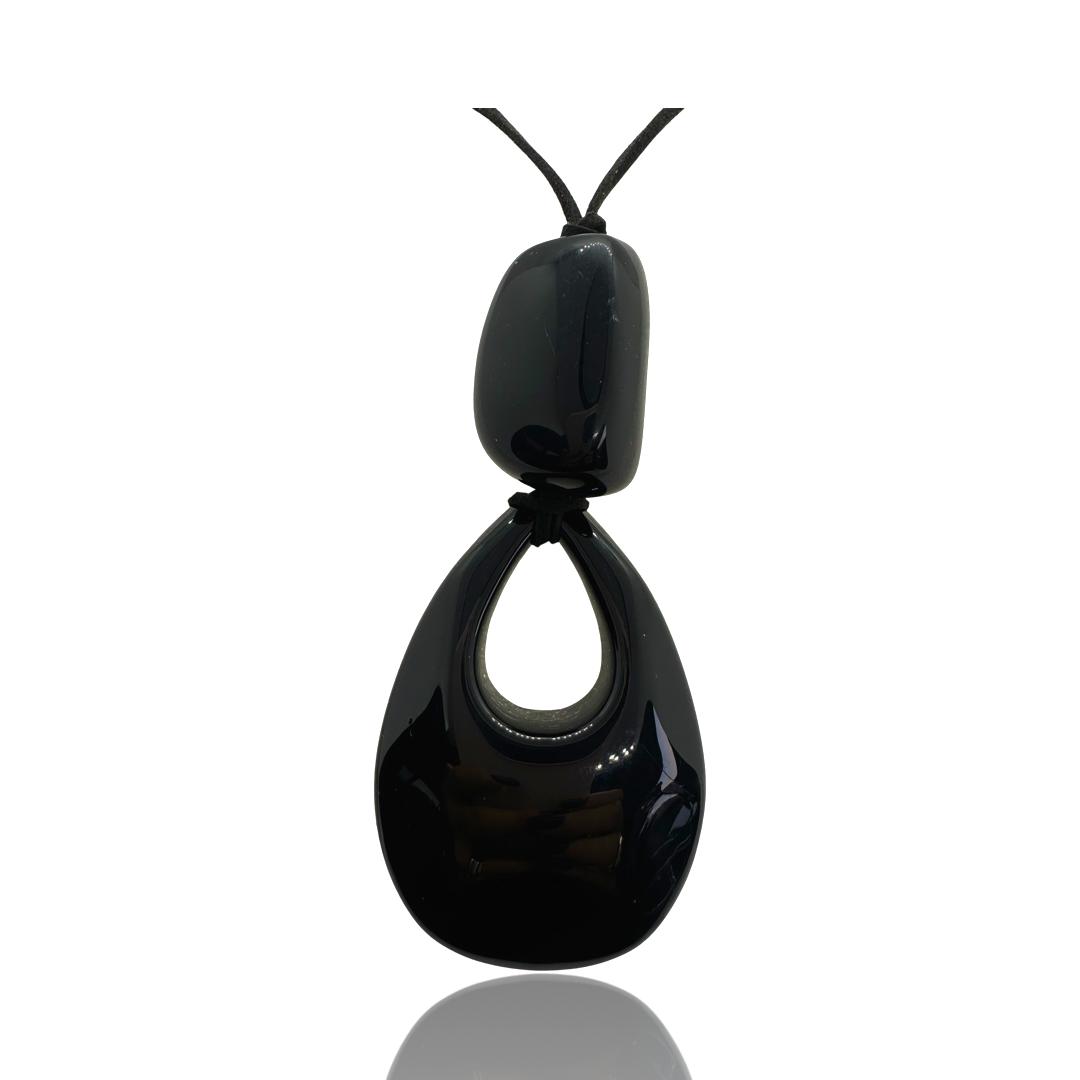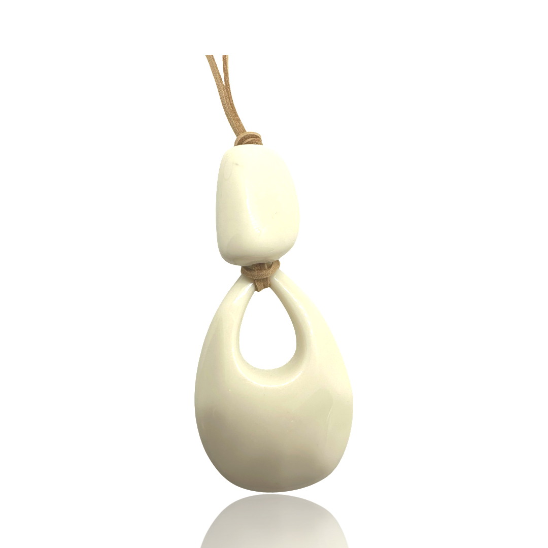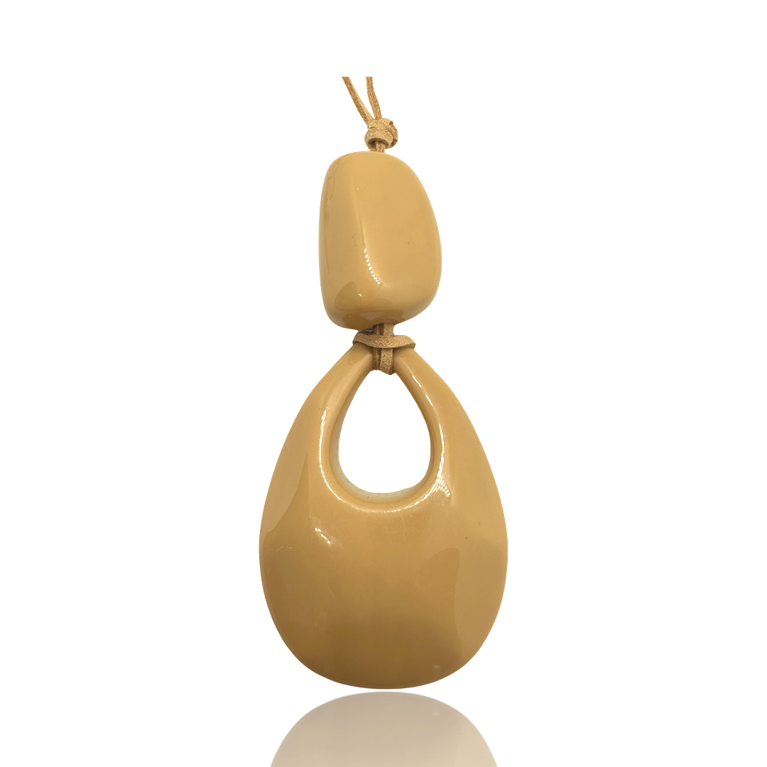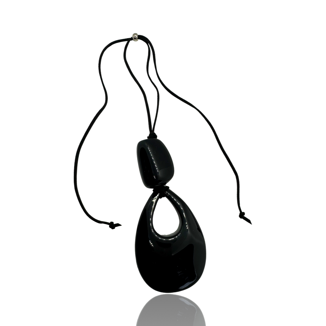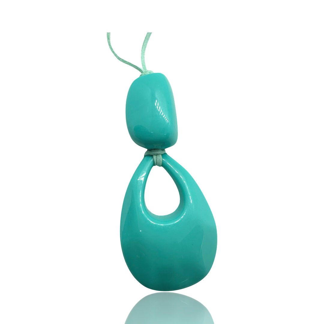 Colar longo, fio de chamois regulável e pingente gota de resina. Leve e super autêntico. Experimente usar com vestidos longos e roupas lisas. Muito estiloso!