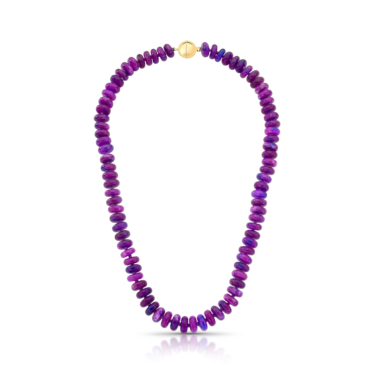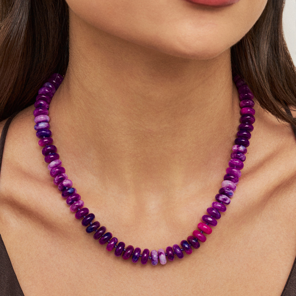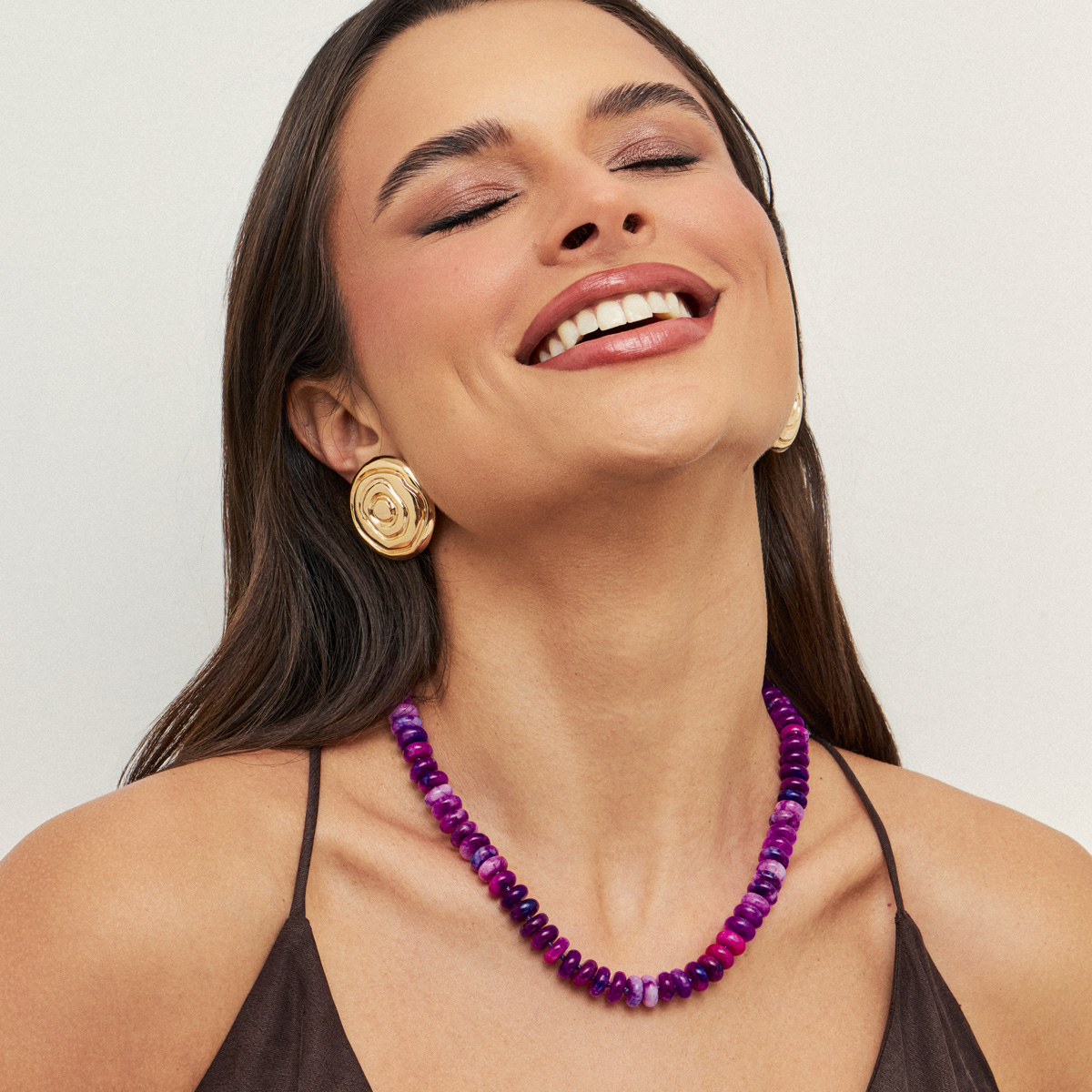 Colar semijoia banho ouro 18k. Todo em pérolas shell redondas e tingidas na cor fúcsia. Fecho magnético. Niquel free