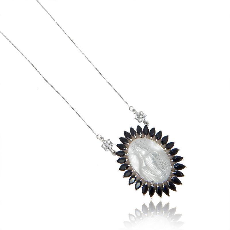 Colar semi joia banho ródio. Mandala oval em madrepérola com Nossa Senhora das Graças estampada e contorno em navetes negras.