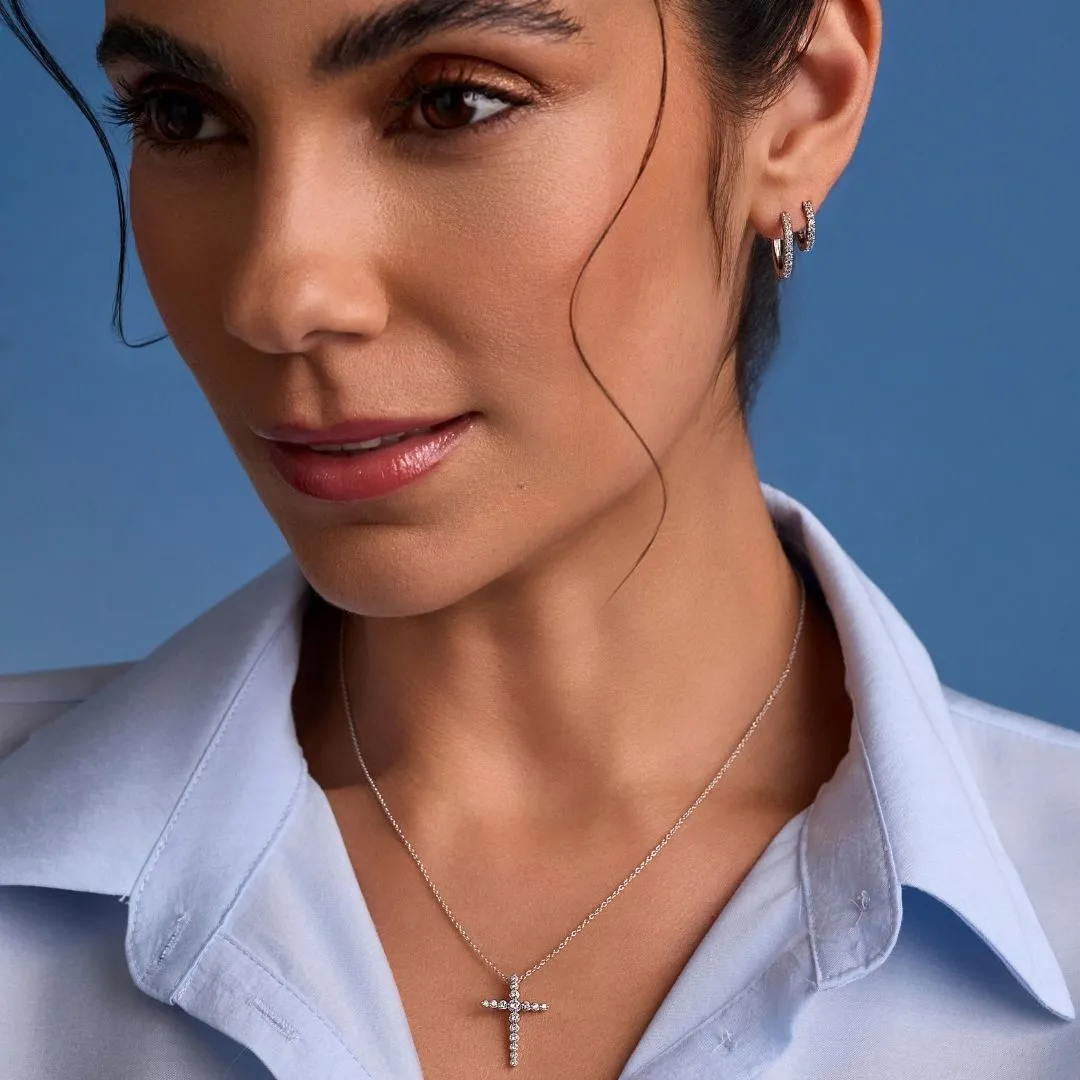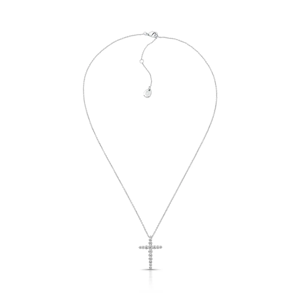 Colar semijoia banho ródio. Corrente mini elo português com pingente cruz em zircônias redondas. Niquel free