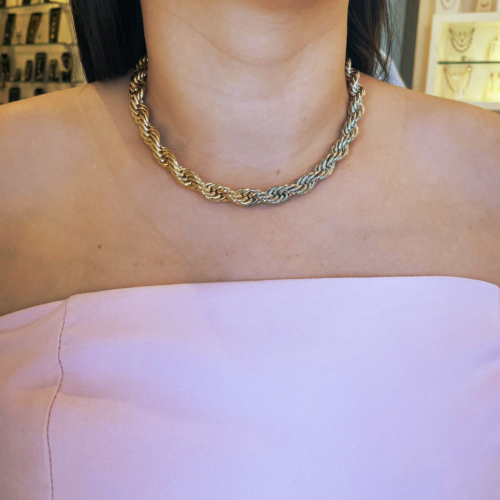 Colar semijoia mix banhos ouro 18k e ródio. Cordão baiano (elos trançados) em duo de cores. Niquel free