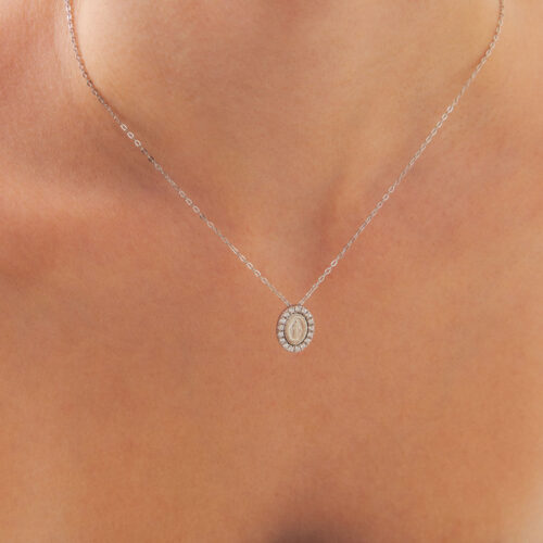 Colar joia em prata 925 com banho ródio. Corrente mini elos com medalha oval Nossa Senhora das Graças com contorno cravejado. Niquel free
