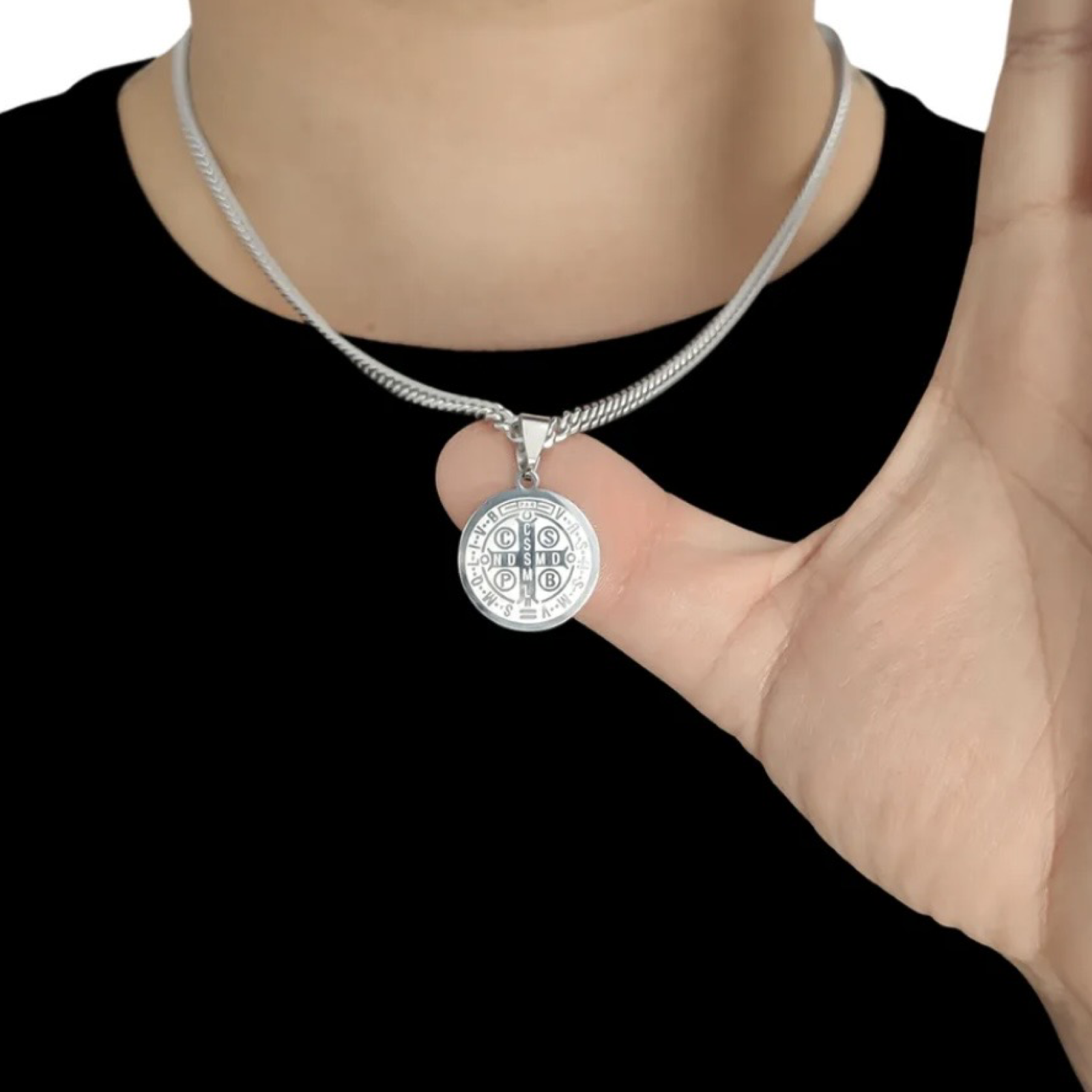 Colar em aço inoxidável. Corrente com pingente medalha São Bento estampa a laser, frente e verso. Unisex. Niquel free