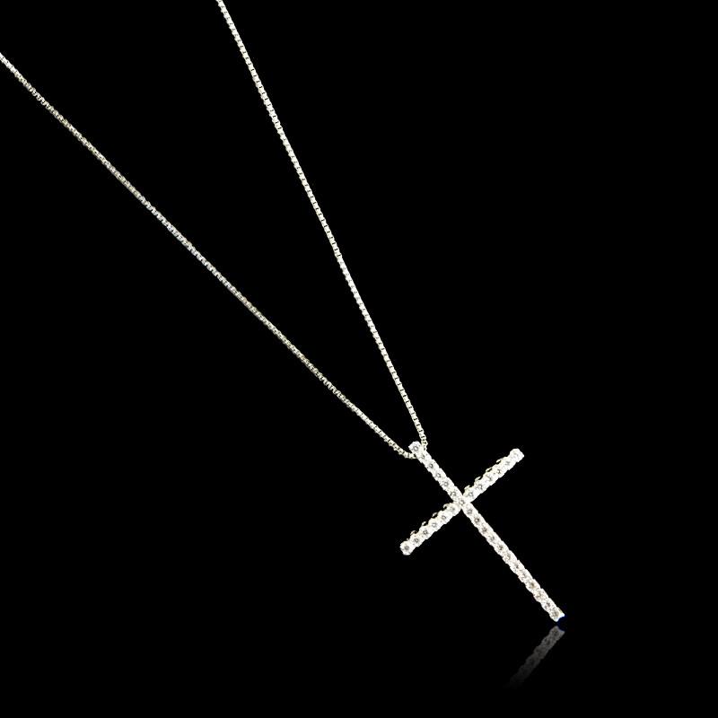 Colar semi joia banho ródio. Corrente veneziana com pingente crucifixo médio, cravejado e com galeria.