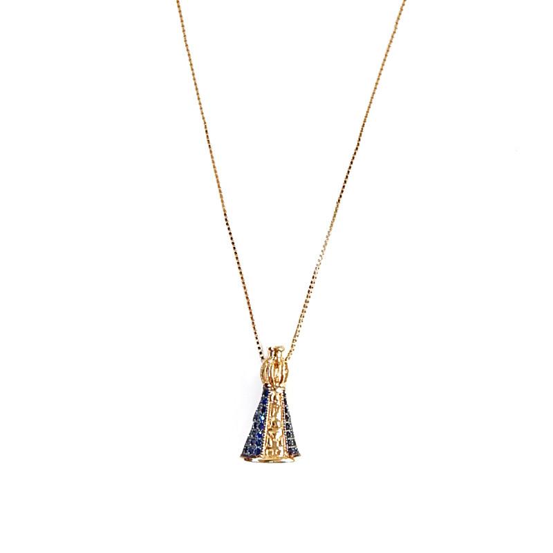 Colar semi joia banho ouro 18k. Pingente com Nsa Sra Aparecida, formato cônico, manto cravejado em micro zircônia safira. Corrente veneziana.