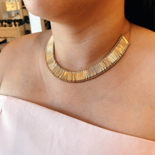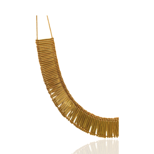 Colar semijoia banho ouro 18k. Modelo choker, toda em palitos sobre corrente dupla, tipo “esteira”. Fecho ímã. Niquel free