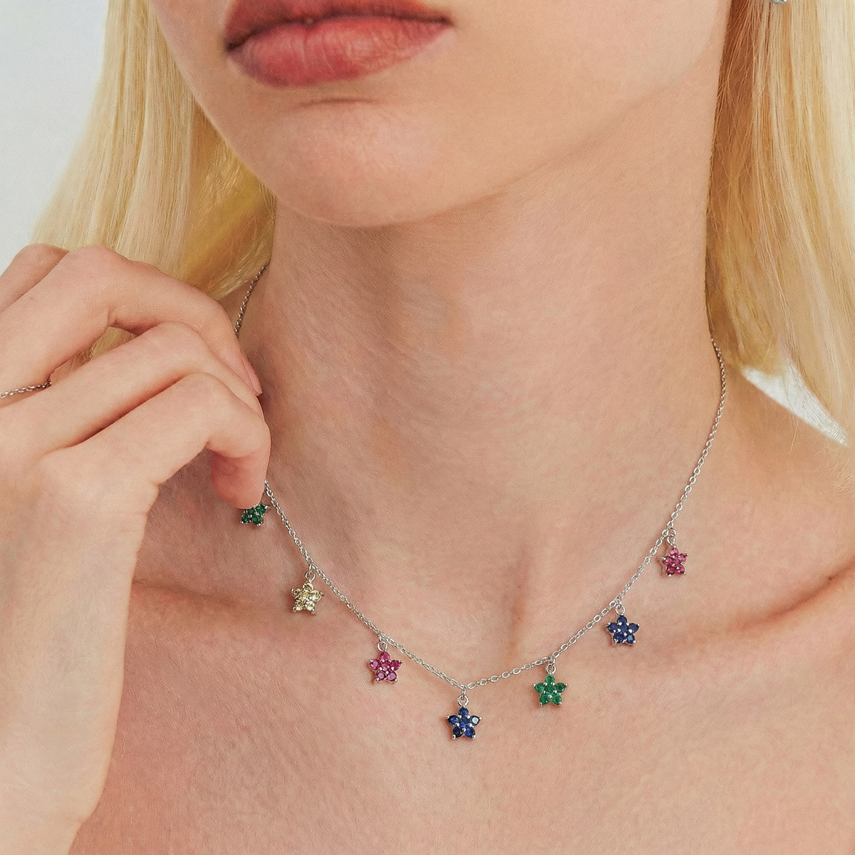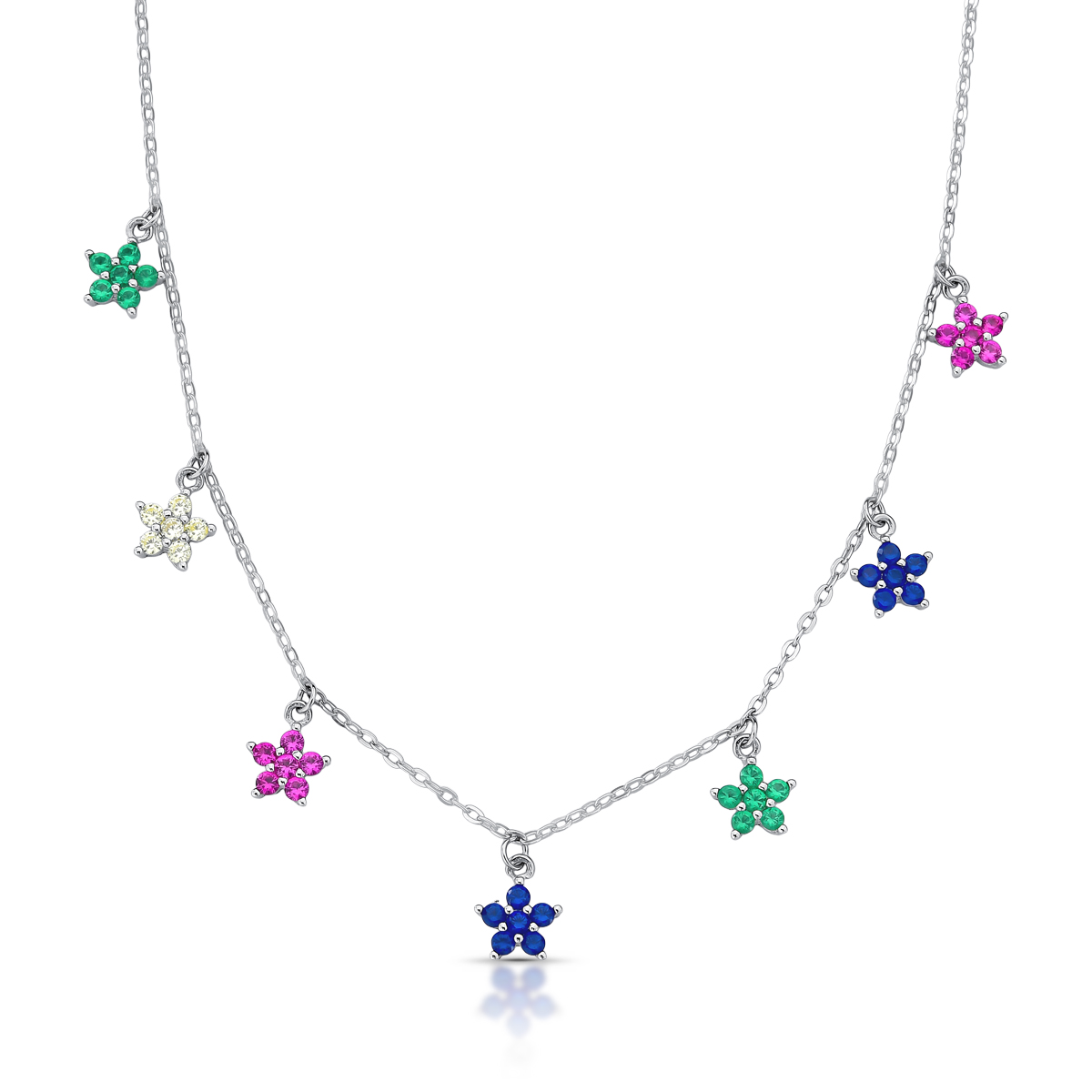 Colar joia de prata 925 com banho ródio. Corrente mini elo português, 7 flores em zircônias multicoloridas: safira, esmeralda e rubi. Niquel free