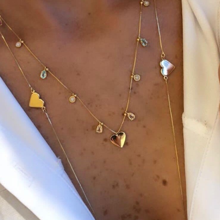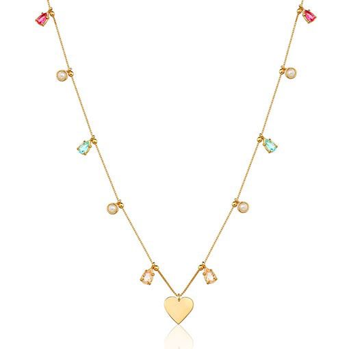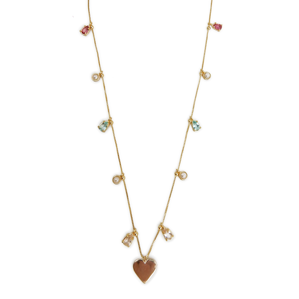 Colar semi joia. Corrente mini bolinhas com berloques 6 gotas em cristal – mix cores -, 3 mini pérolas e 1 coração liso e chapado