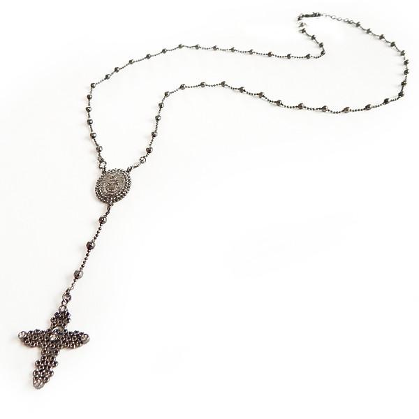 Colar semi joia banho ródio negro. Corrente bolinhas 66 cm + 4,0 cm de extensor. Medalha oval Nossa Sra das Graças com contorno granitado. Pendente com crucifixo rendado e pontos de zircônia, medindo 7,0 cm de comprimento