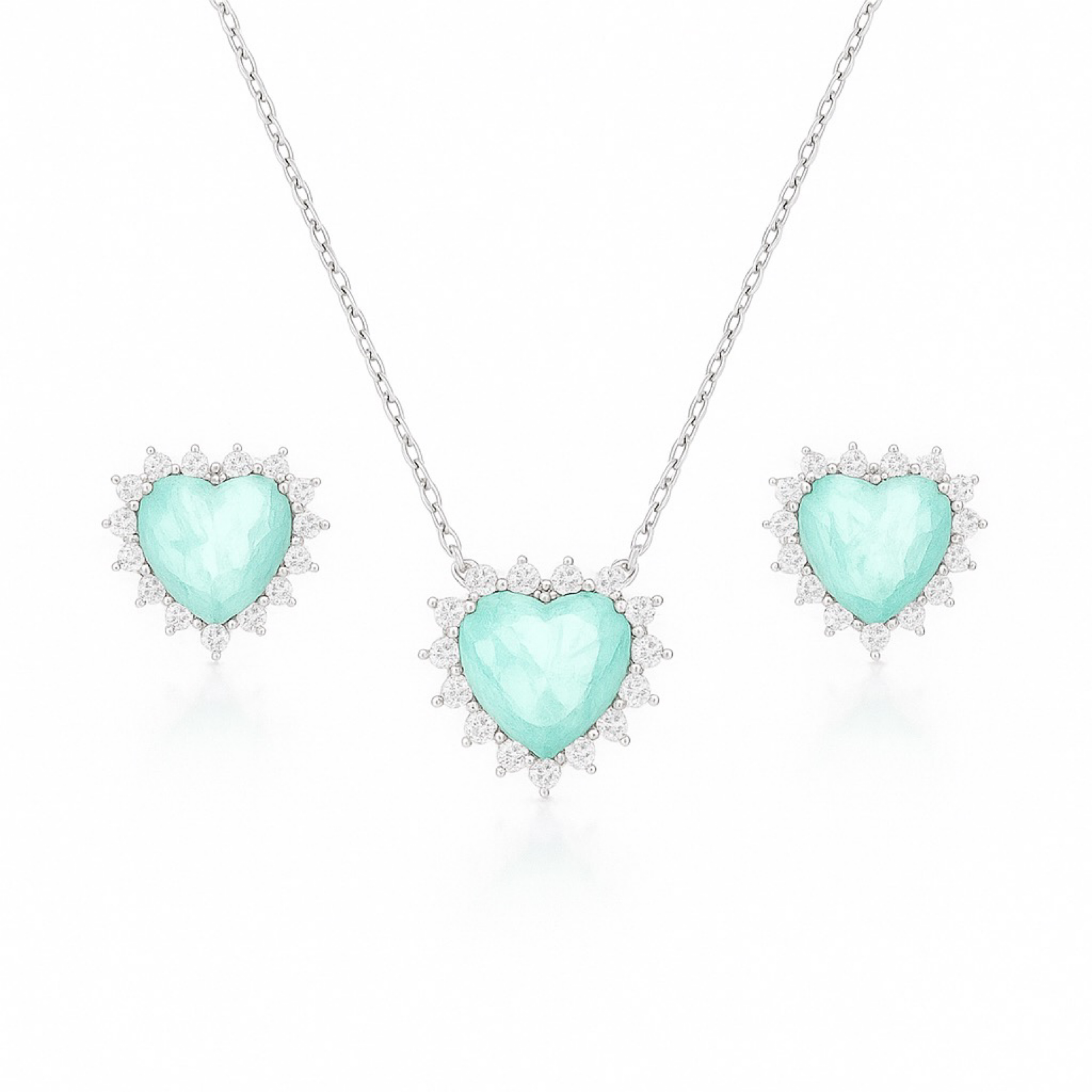 Conjunto joia em prata 925 com banho ródio. Colar + brincos. Coração cristal fusion cor esmeralda colombiana com contorno cravejado. Niquel free