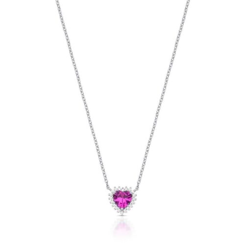 Conjunto joia em prata 925. Colar e brincos. Coração cristal na cor rubelita, facetado. Contorno cravejado. Niquel free