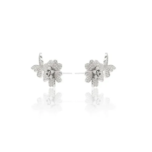 Brinco semijoia banho ródio. Modelo ear cuff. Flor e borboleta. Todo cravejado com zircônia cristal. Acompanha tarraxa mágica. Niquel free