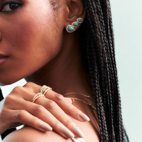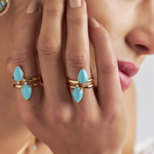 Brinco semijoia banho ouro 18k. Modelo ear cuff. Gotas de turquesa reconstituída de tamanhos decrescentes e contorno cravejado. Acompanha tarraxa anatômica. Niquel free
