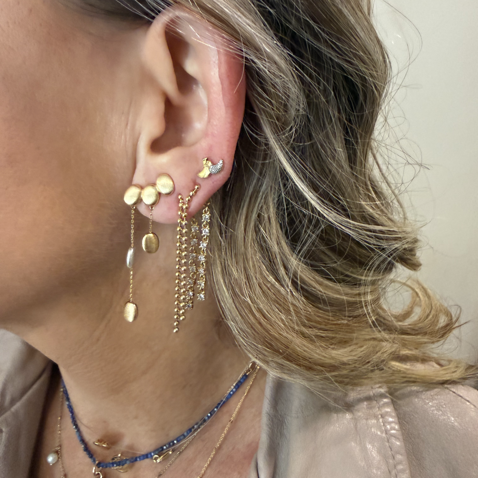 Brinco semijoia mix banhos foscos. Modelo ear cuff todo em pastilhas, corrente dupla em dois tamanhos. Acompanha tarraxa de suporte. Niquel free