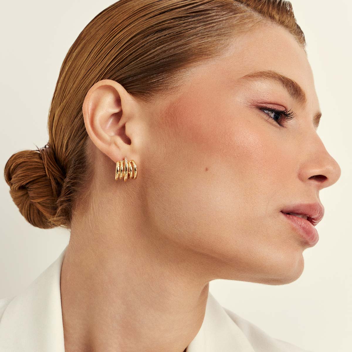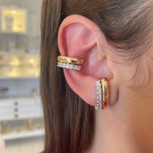 Brinco semijoia banho ouro 18k. Modelo ear cuff tipo mola, fios em tamanhos descrescentes com mini pontos de zircônia. Niquel free