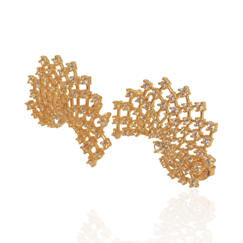 Brinco semijoia banho ouro 18k. Modelo ear cuff todo em pontos de zircônia cristal, formato “meia lua”. Clipe lateral para encaixe superior. Niquel free