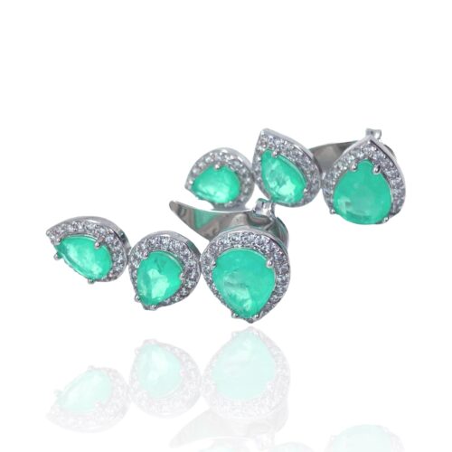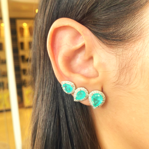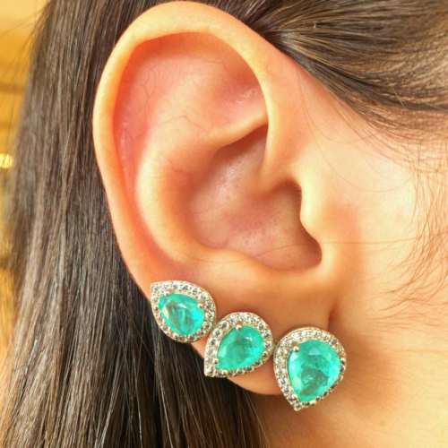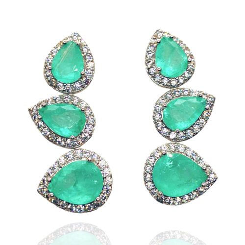 Brinco semijoia banho ródio. Modelo ear cuff com 3 gotas em cristal esmeralda colombiana fusion, em tamanhos decrescentes e contorno cravejado. Acompanha tarraxa de suporte. Niquel free