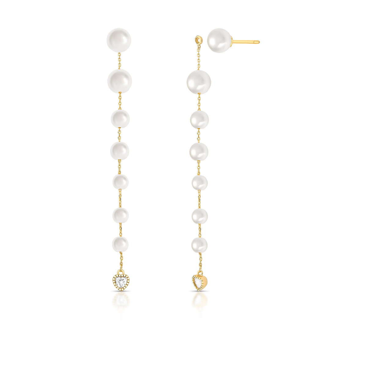 Brinco semijoia banho ouro 18k. Modelo ear jacket (dois em um). Base pérola desmontável + corrente longa com 6 pérolas em tamanhos decrescentes. Coração cristal na extremidade. Niquel free