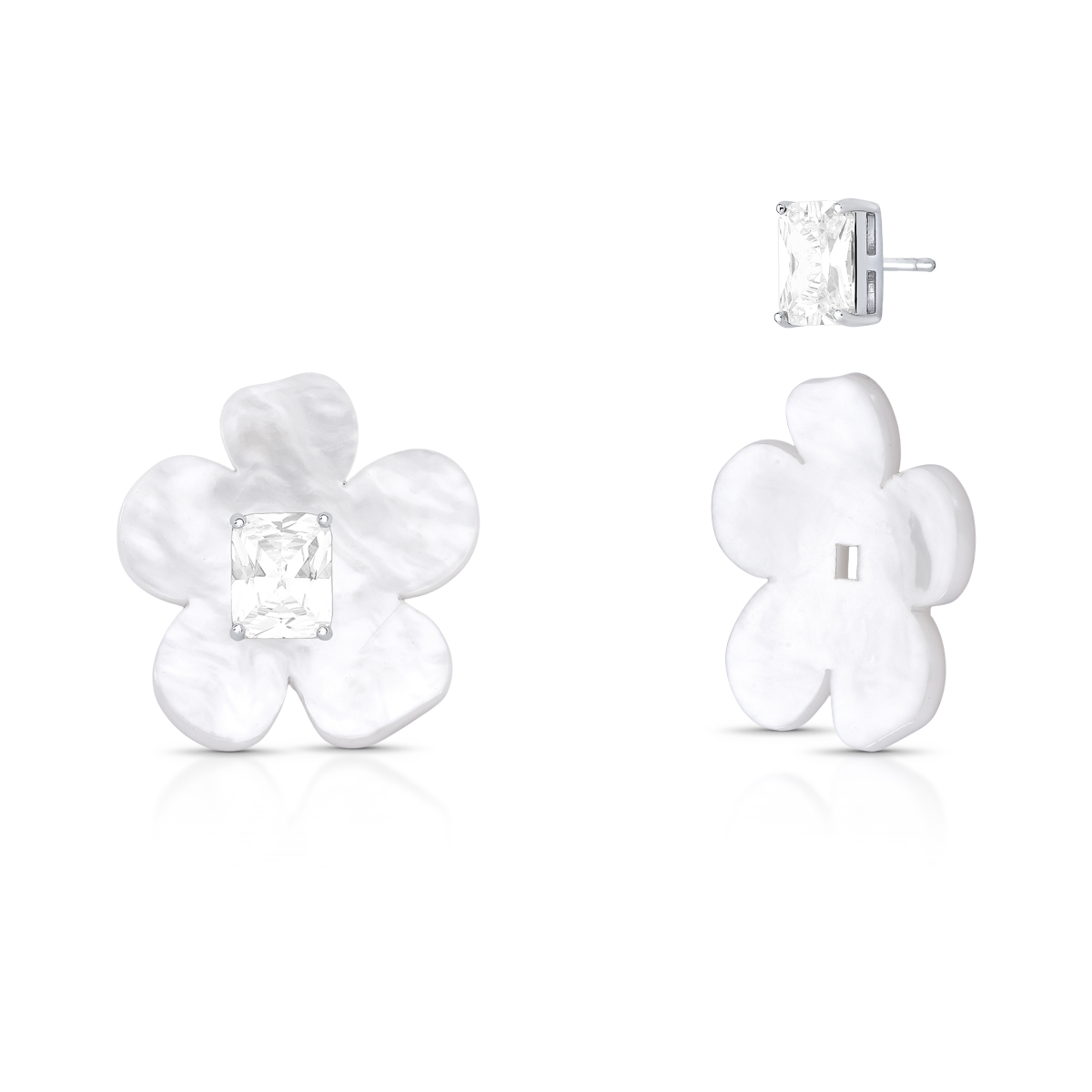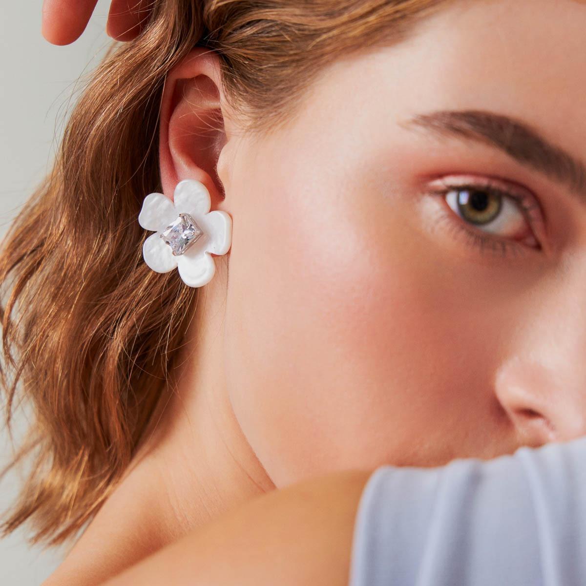 Brinco semijoia banho ródio. Modelo ear jacket, dois em um, desmontável, flor em madrepérola sintética e ponto de luz em cristal facetado retangular. Niquel free