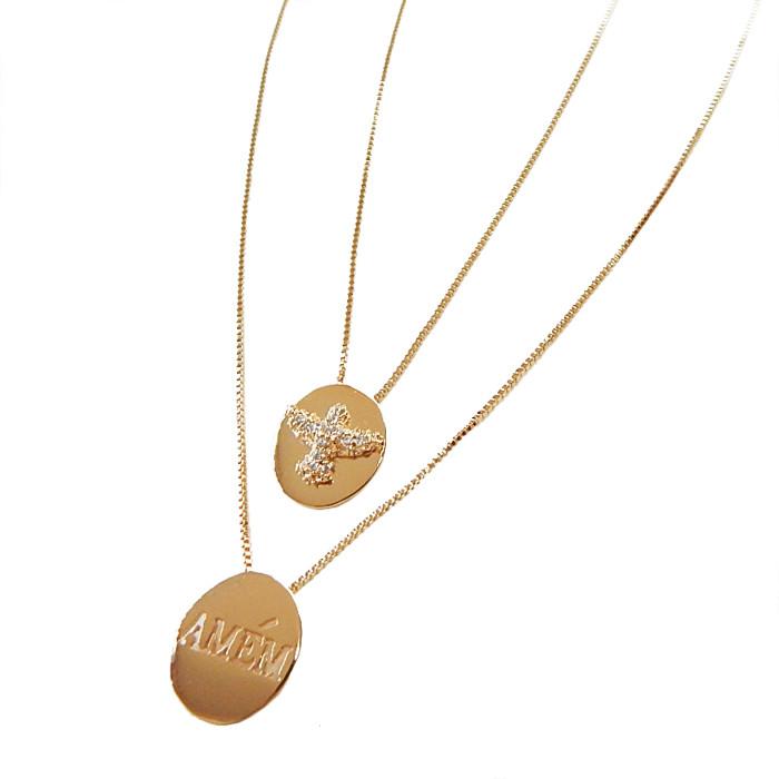 Colar escapulário semi joia. Modelo 2 x 1. Placas ovais: uma com Divino Espírito Santo Cravejado e a outra com gravação vazada “Amém”