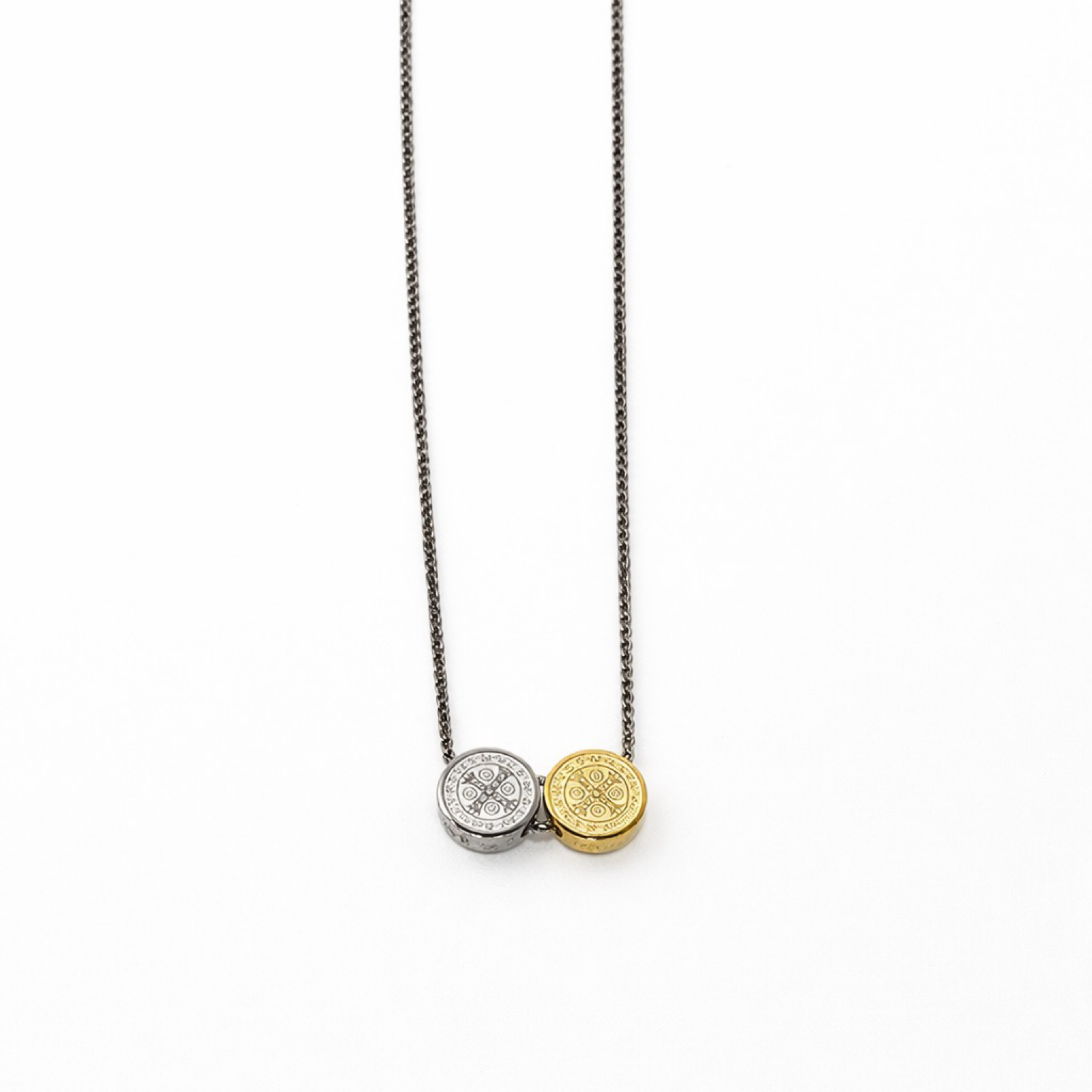 Colar semijoia em aço inoxidável (mix c/banbo ouro). Escapulário São Bento corrente veneziana e placas móveis redondas em 3D. Unissex. Hipoalergênico