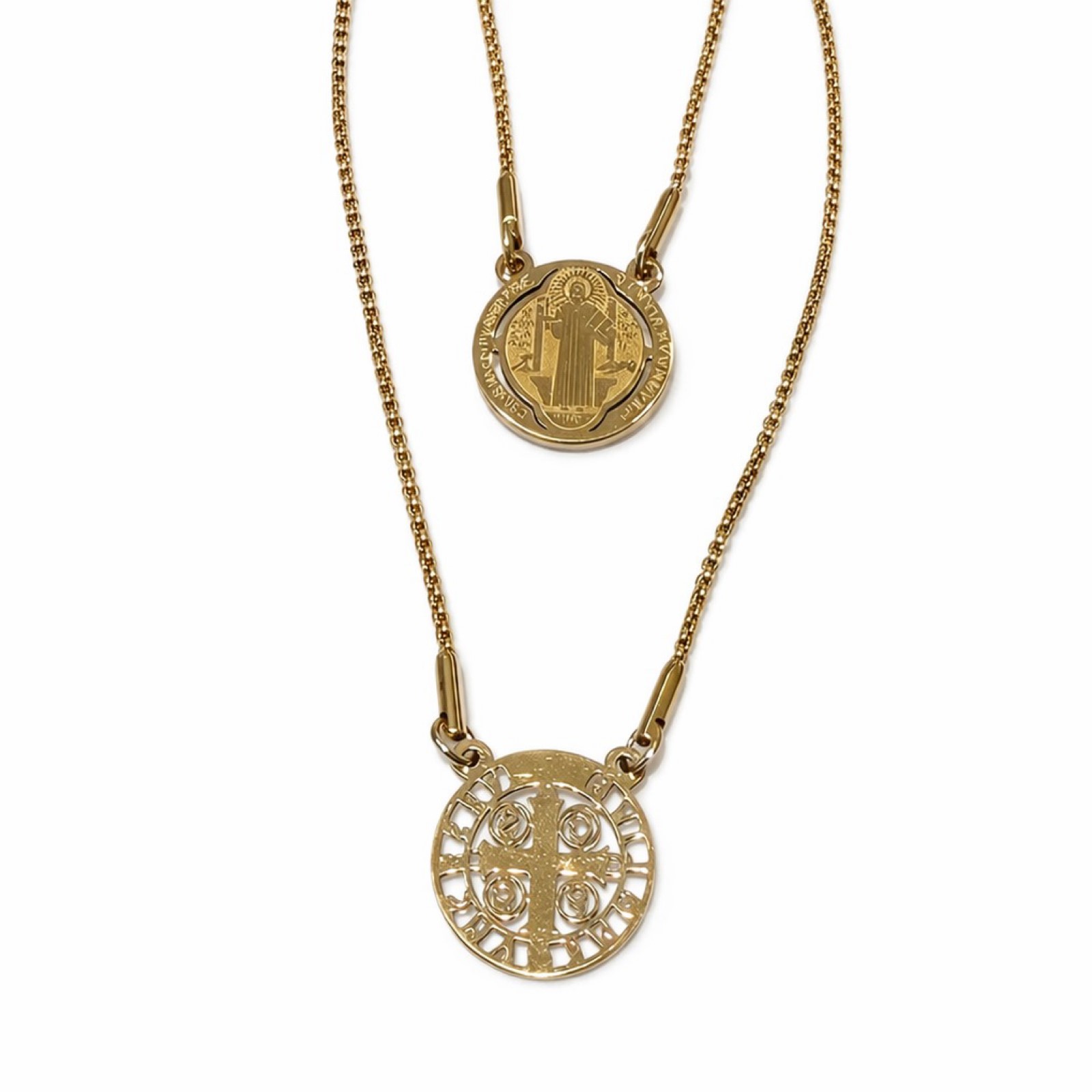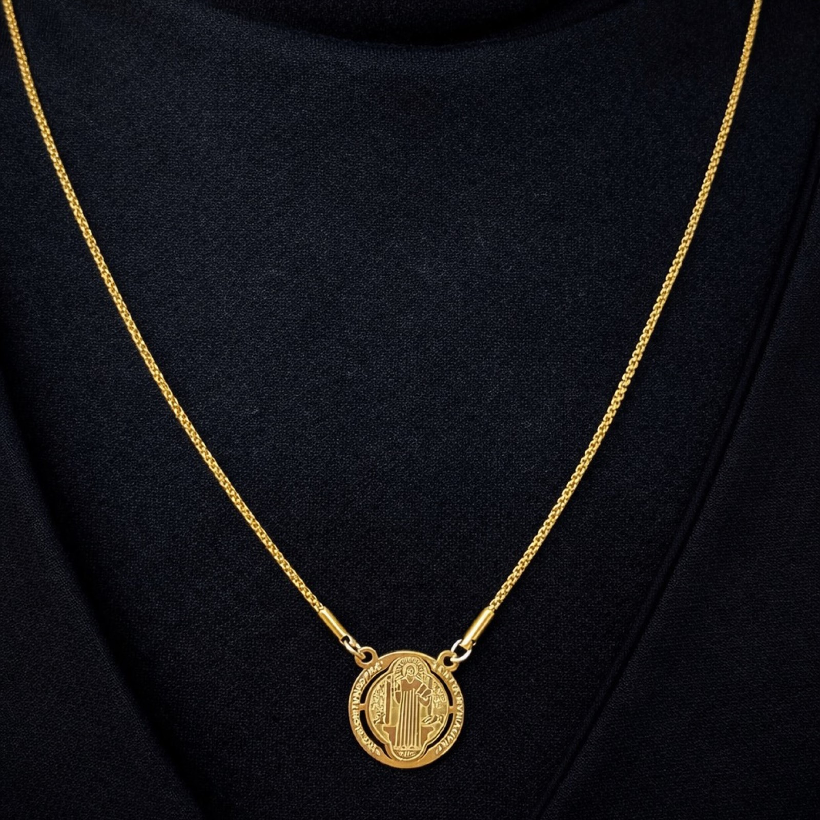 Colar semijoia em aço inoxidável com banho ouro. Escapulário São Bento corrente veneziana e placas fixas vazadas. Unissex. Hipoalergênico