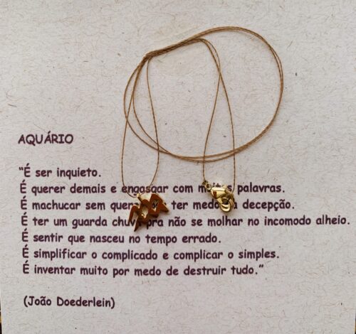 Peça da Coleção Le Poème: montado no fio de seda tamanho 40cm – tamanho adulto -, ajustável manualmente e cuidadosamente embalado com poema anexo em papel reciclável e envelope pardo. Banho ouro 18k