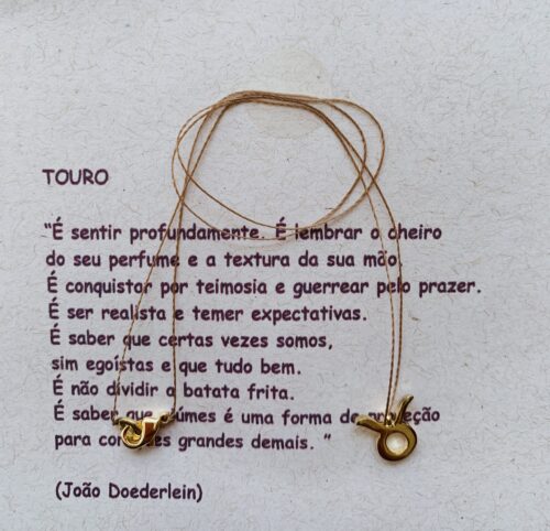 Peça da Coleção Le Poème: montado no fio de seda tamanho 40cm – tamanho adulto -, ajustável manualmente e cuidadosamente embalado com poema anexo em papel reciclável e envelope pardo. Banho ouro 18k
