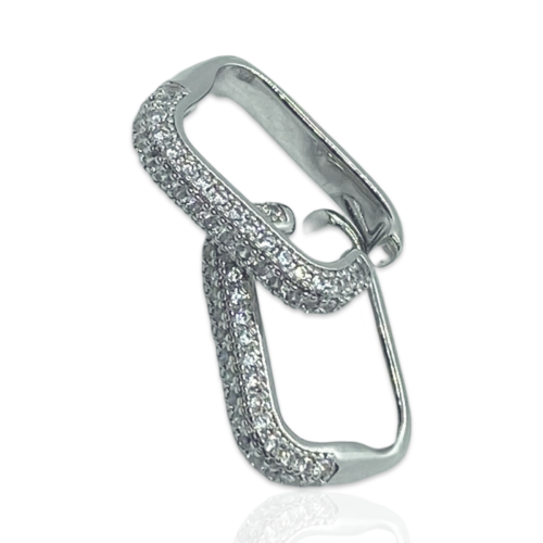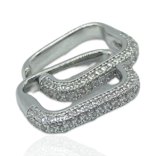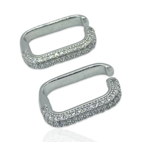 Brinco semijoia banho ródio. Falso ear hook ou falso piercing. Argola sem pino e sem tarraxa – apenas encaixável ao lóbulo. Formato retangular com frente micro cravejada