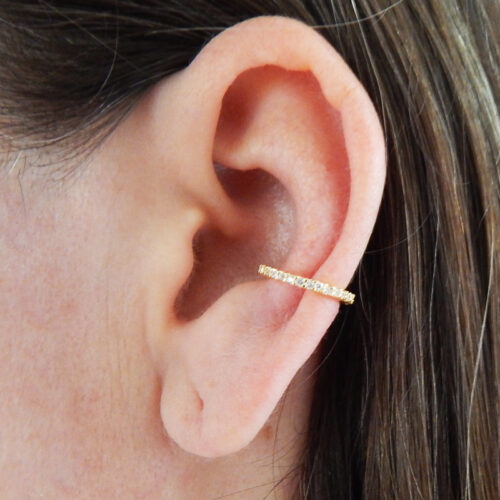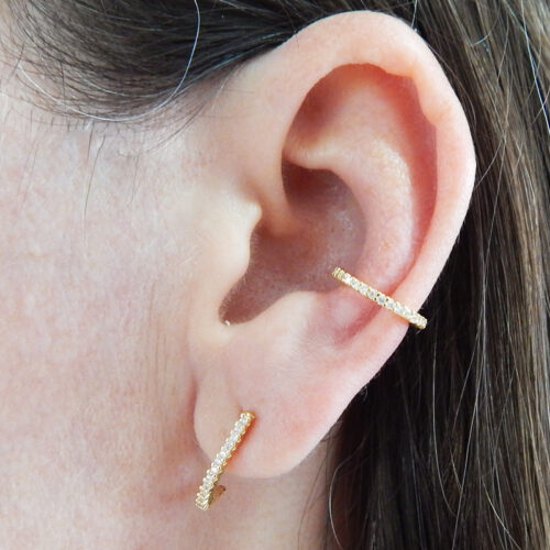 Falso piercing semi joia banho ouro 18k. Argola unilateral, encaixável, manualmente ajustável e micro cravejada. Níquel free.