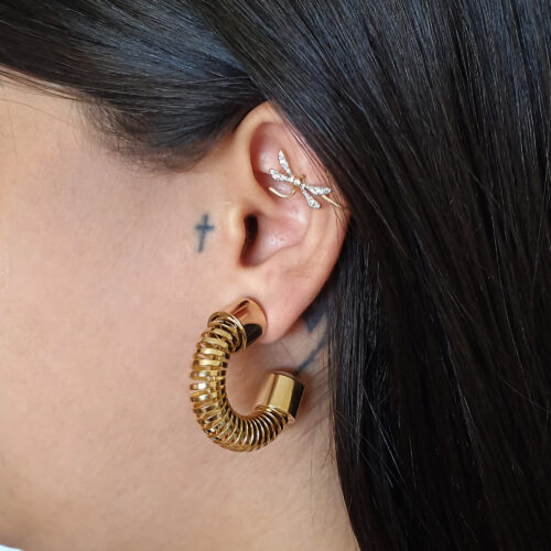 Falso piercing semi joia banho ouro 18k. Unilateral. Libélula canetada em ródio, 5 pontos de zircônia. Gancho confortável e manualmente ajustável. Níquel free.