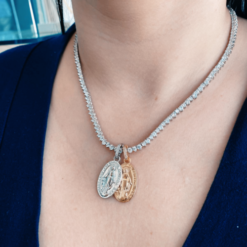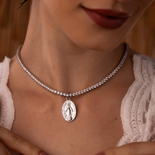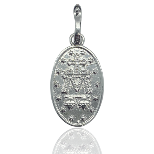 Pingente semijoia banho ródio. Medalha oval Nossa Senhora das Graças – estampa frente e verso. Pingente alça cravejada, fecho clique e removível em tamanho especial para rivieras ou cordões espessos. Niquel free
