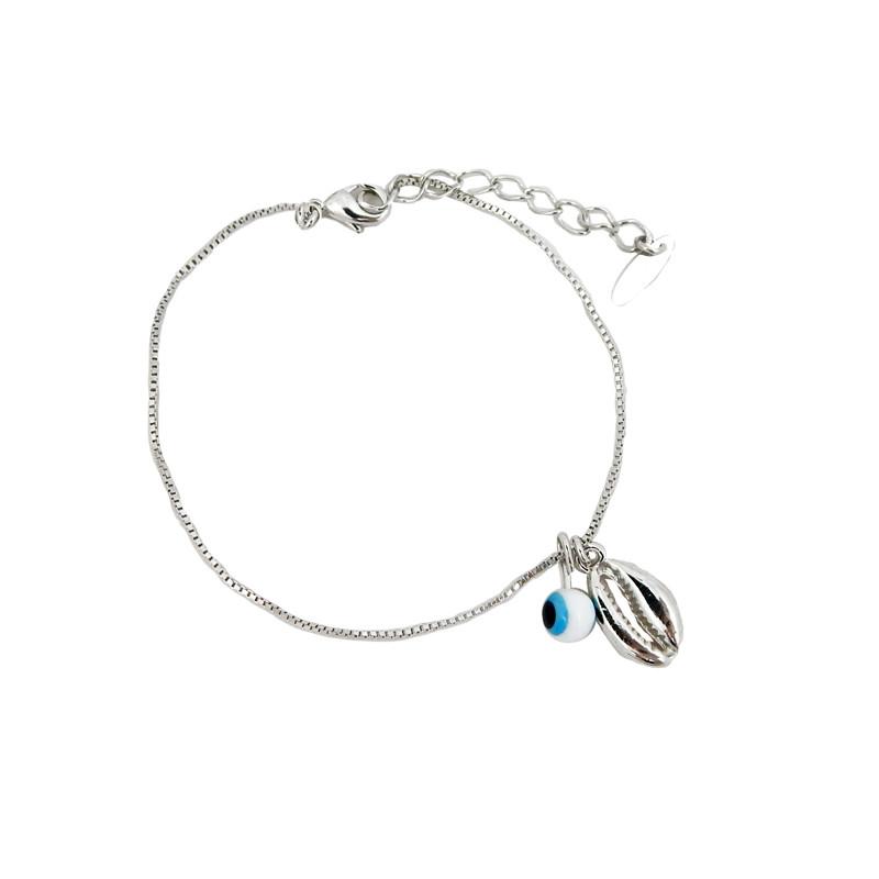 Pulseira semi joia banho ródio. Corrente veneziana, berloques: olho grego redondo branco e búzio liso.