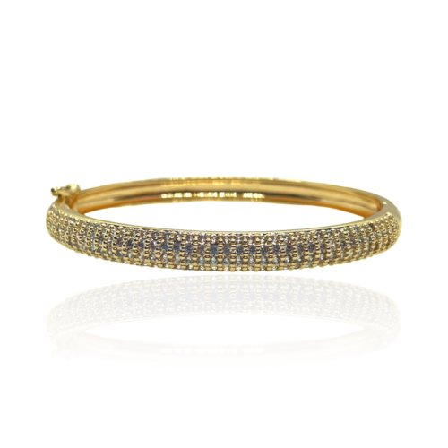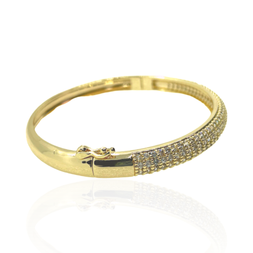 Pulseira semijoia banho ouro 18k. Bracelete rígido articulado, abaulado com frente cravejada em zircônia cristal. Fecho gaveta. Niquel free