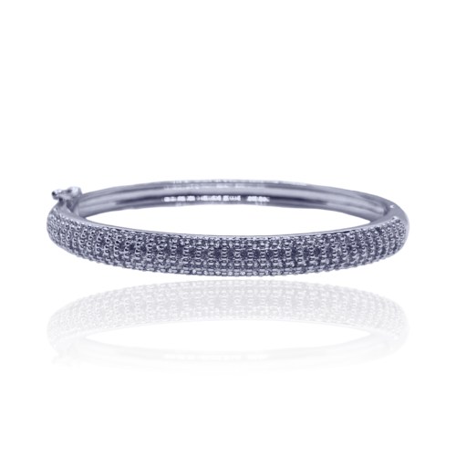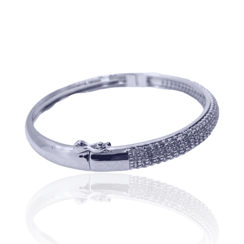 Pulseira semijoia banho ródio. Bracelete rígido articulado, abaulado com frente cravejada em zircônia cristal. Fecho gaveta. Niquel free