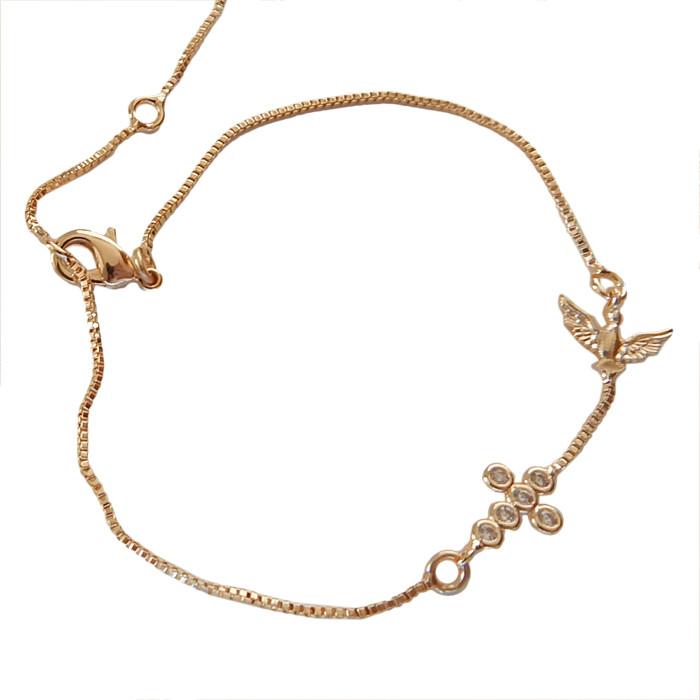 Pulseira semi joia. Corrente veneziana, crucifixo com 5 ptos de luz em zircônia cristal, Divino Espírito Santo pequeno.