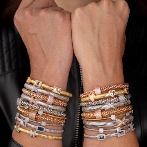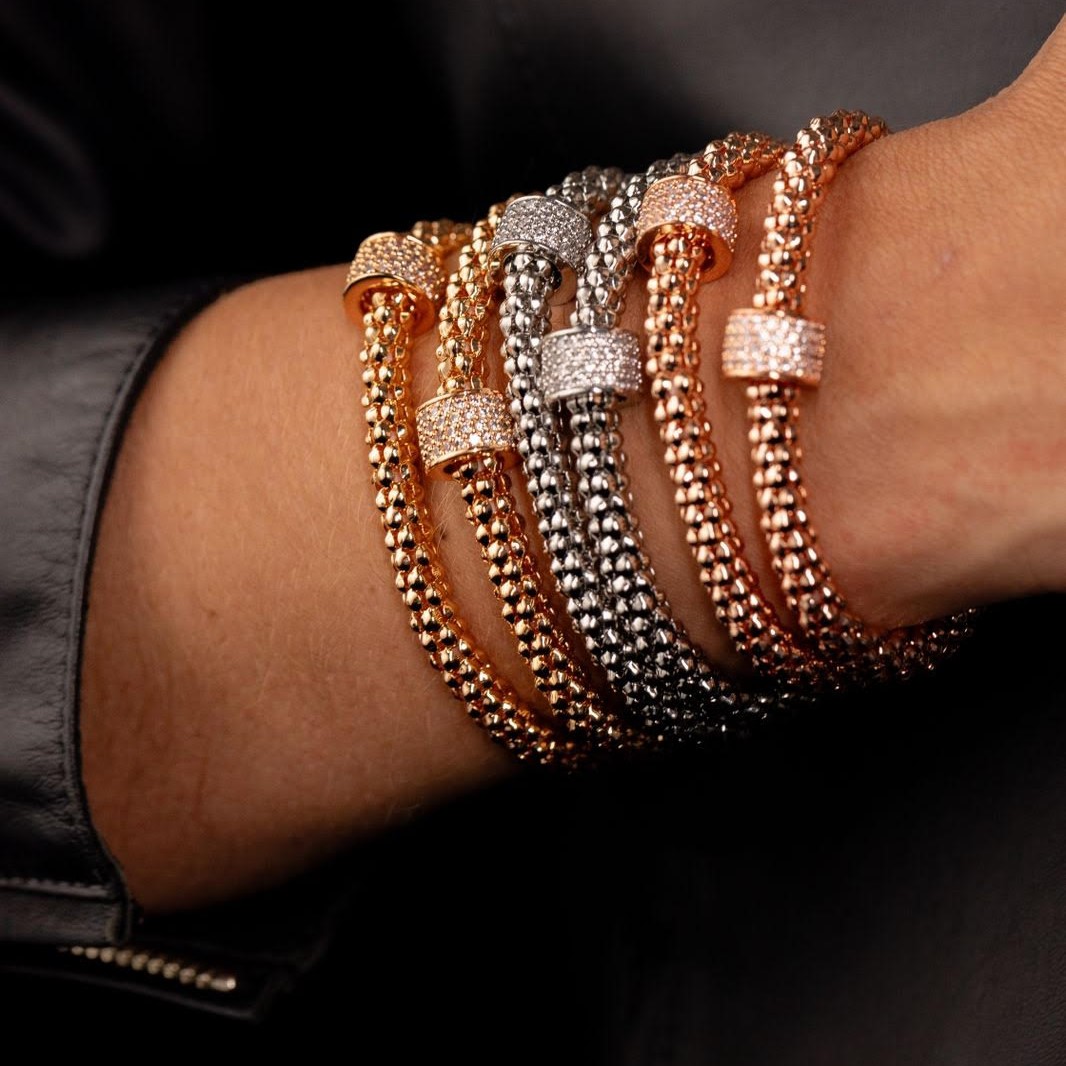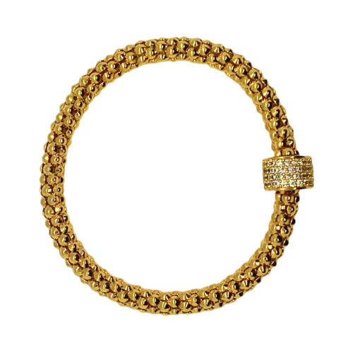 Pulseira semijoia em aço inoxídável banho ouro 18k. Tubo granulado em silicone – sem fecho – com aro cravejado com zircônias. Niquel free