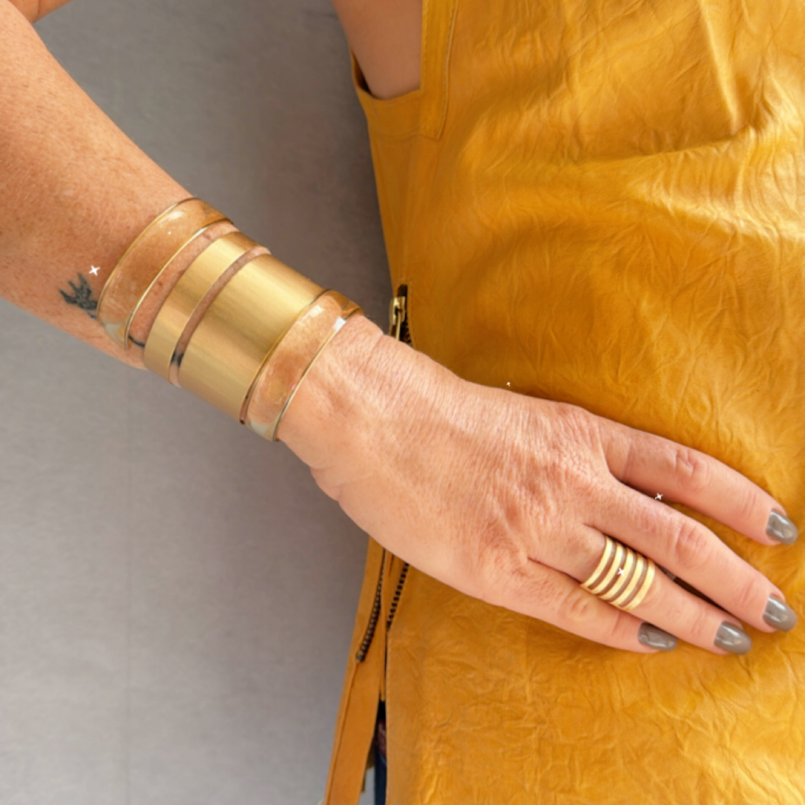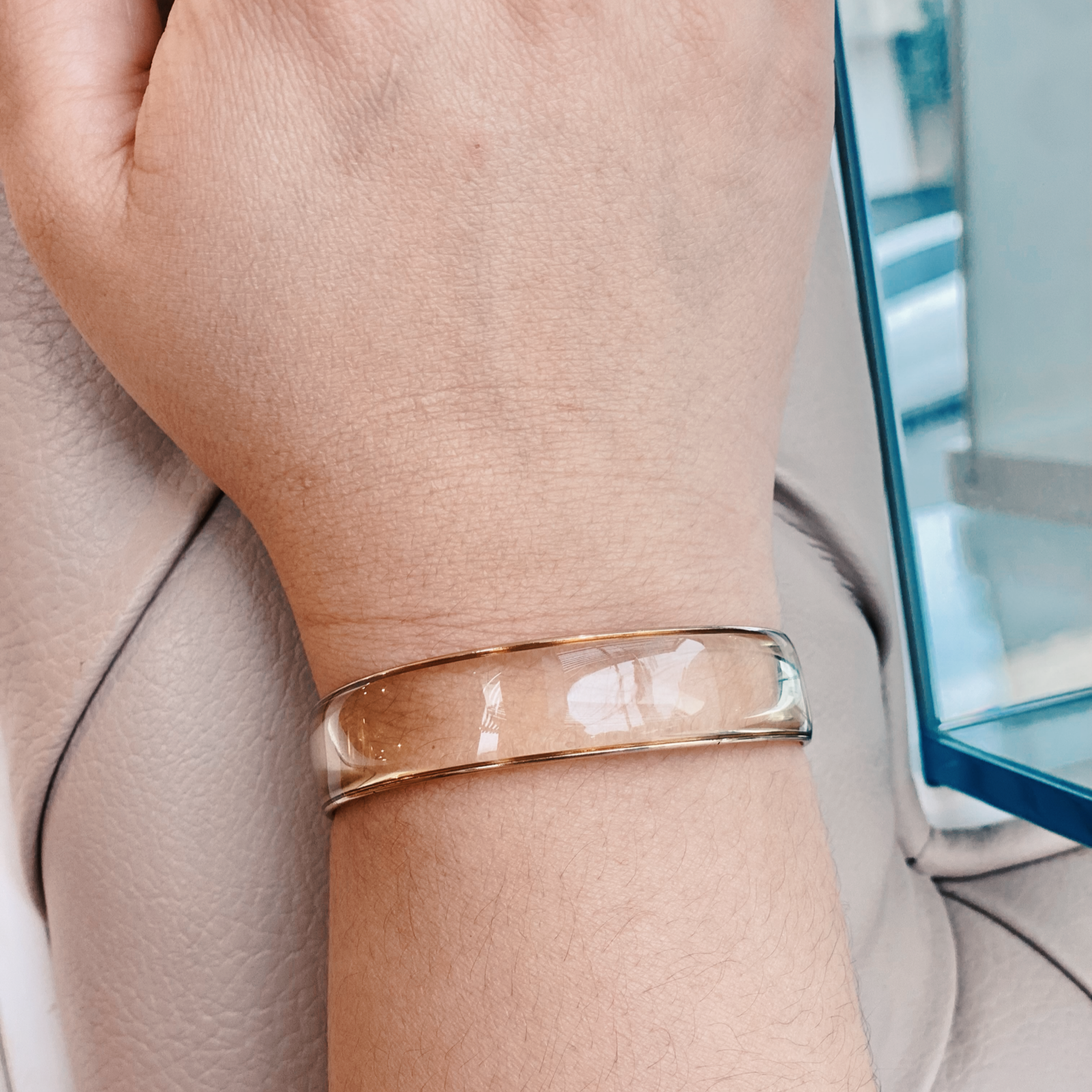 Pulseira bijuteria banho dourado. Modelo bracelete em acrílico transparente, com fenda e frisos dourados lisos nas extremidades.