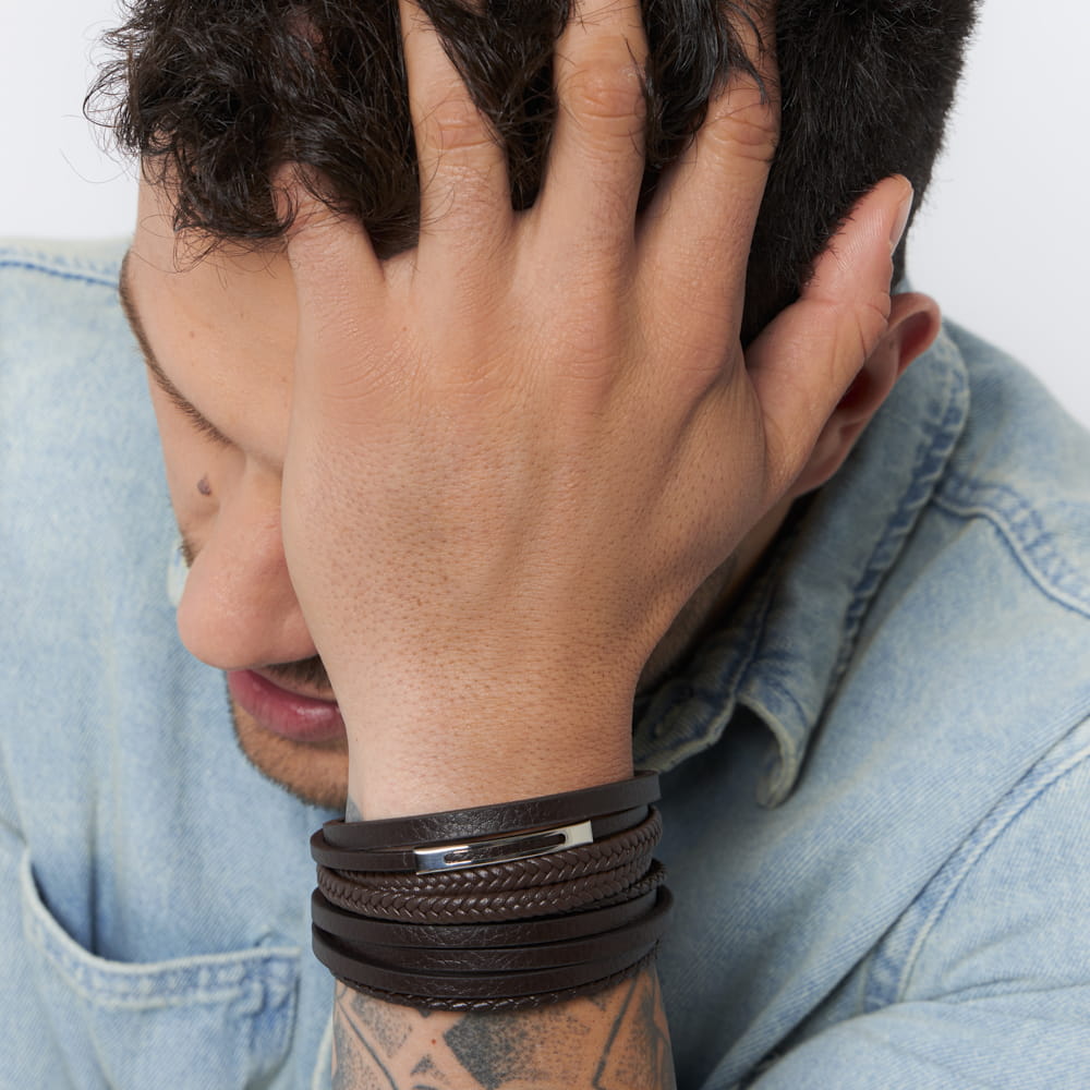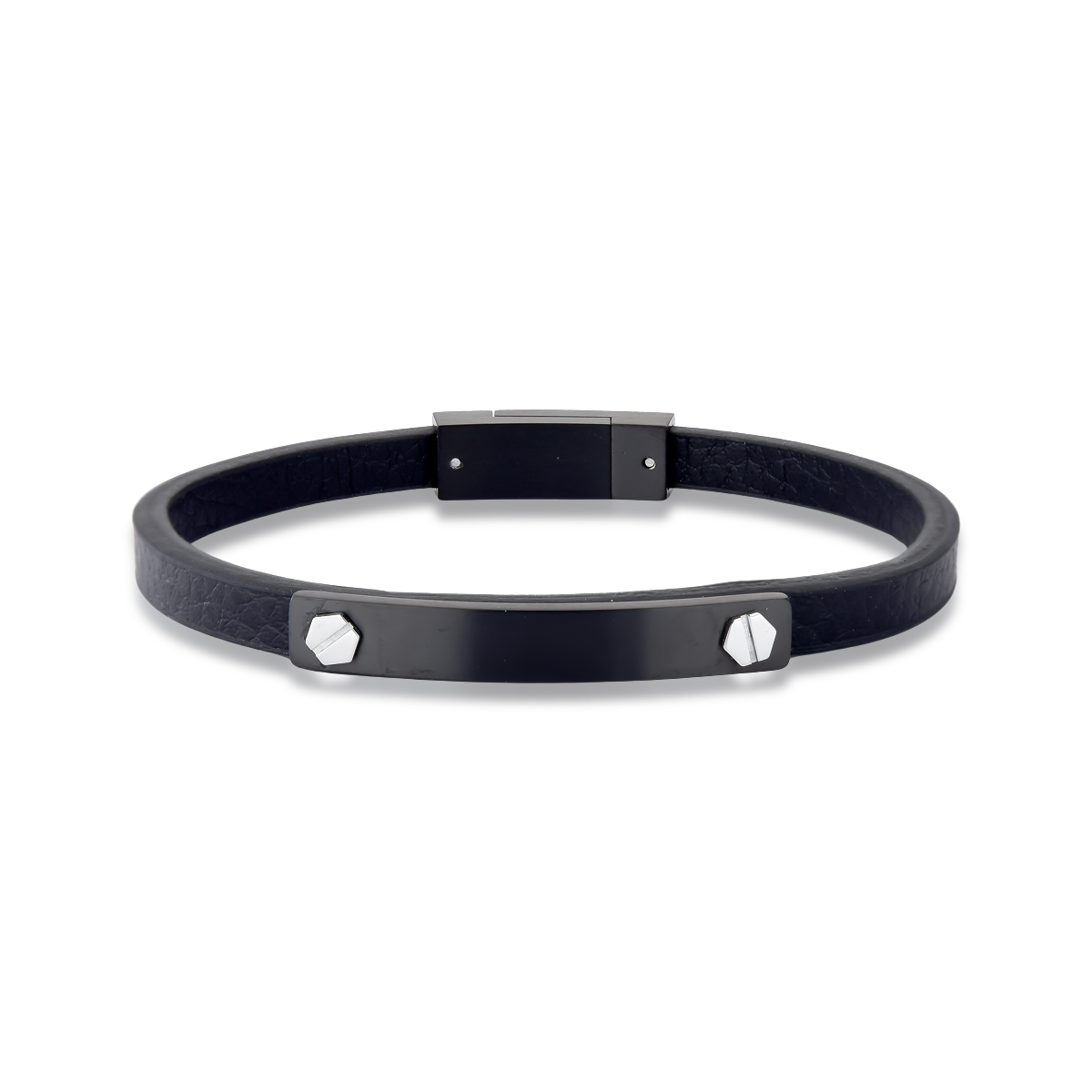 Pulseira em aço inoxidável preto. Fita de couro eco, fina. Detalhe placa de aço negra ao centro e 2 “parafusos”. Fecho magnético. Niquel free